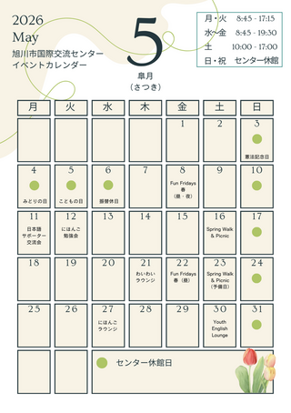 中高生対象!!英語力を開花させよう🌷 🌸Youth English Lounge Spring 2026🌸日 時:5月30日(土)2:00pm~4:00pm場 所:旭川市国際交流センター 交流ラウンジ (フィール旭川7階)参加費:100円申込み:5月11日(月)9:00〜お申込みはこちら 今回は『オ
