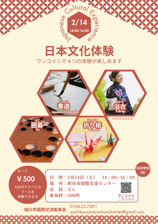 「日本文化体験」やります! 日時:2月14日(土)14:00~16:00 場所:旭川市国際交流センター 交流ラウンジ・会議室(フィール旭川7階) 参加費:500円 定員:なし 「書道」「浴衣」「囲碁」「折り紙」の4つのブースを500円で全て体験できます! ワンコインでこんなに体験できるのはここだけか