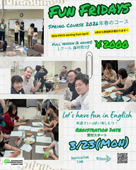 (ENGLISH BELOW) 英語で交流できる場としてFun Fridays Spring Session がスタートします。 レベルは気にせずに、楽しく英語で話しましょう。 お申し込みはこちら 0166-25-7491 ※4月から参加費が2,000円となります 《開催日時》 昼の部 : 第2・第