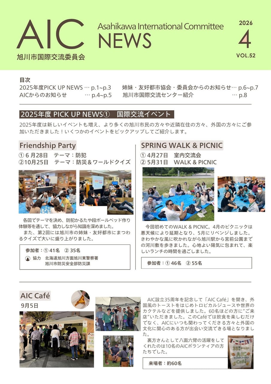 年に一度発行のAIC NEWSでは、AIC(旭川市国際交流委員会)の活動紹介や