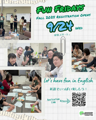 (ENGLISH BELOW) 英語で交流ができる場として、Fun Fridays Autumn Session が9月24日から受付スタートです。 お申込みはこちらをクリック レベルは気にせず、楽しく英語で話しましょう! ※定員を超えて申込みできなかった場合のみこちらから連絡します お問い合わせ: