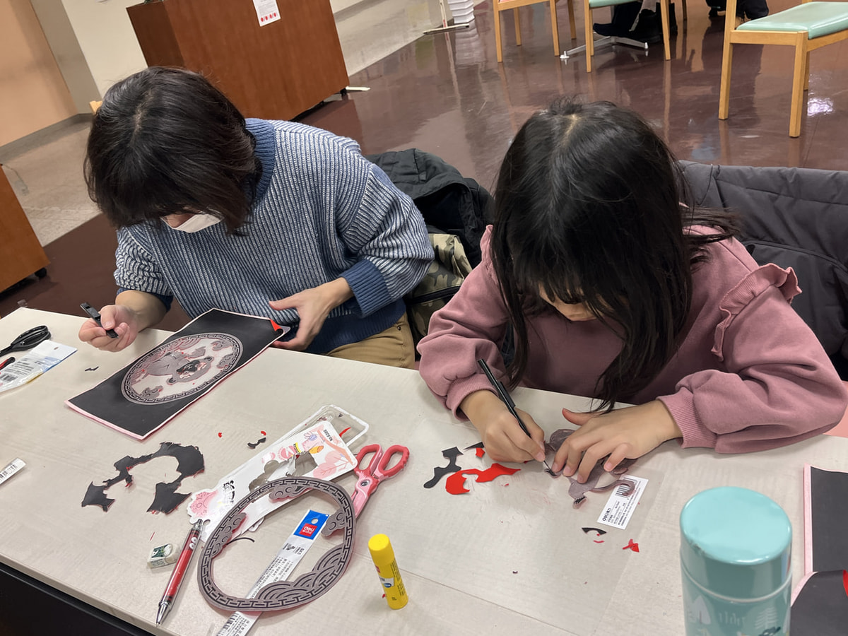自分の干支がデザインされた台紙を選びカッターで図案を切り抜きます🐉🐵